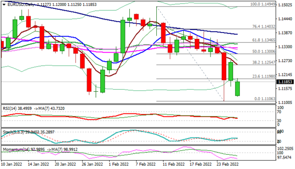 Initial resistance at 1.1200 zone (round-figure / Fibo 23.6% of 1.1494/1.1106 descend) is under pressure, with extended upticks to stall under pivotal barriers at 1.1250 zone (Fibo 38.2% / daily Tenkan-sen) to keep bears in play and offer better levels to re-enter downtrend for acceleration towards targets at 1.1040/1.1000 (Fibo 76.4% of 1.0635/1.2349 /psychological).