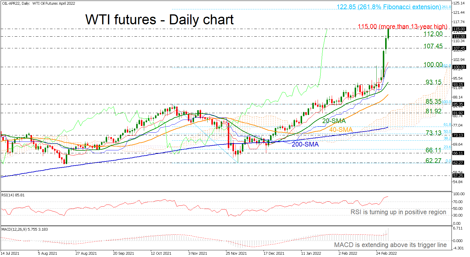 WTI futures are surging with strong momentum towards a fresh more than 13-year high near 115.00. The price recorded two consecutive impressive bullish days, sending the technical indicators into overbought regions. The RSI is holding above its 70 level, while the MACD is strengthening its movement above its trigger and zero lines, both suggesting that the strong upward move may soon come to an end.