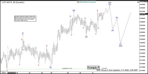 Pair should then pullback in wave ((ii)) to correct cycle from March 1 low before the next leg higher. Near term, as far as pivot at 0.914 low stays intact, expect pullback to find support in the sequence of 3, 7, or 11 swing for further upside in wave ((iii)). The bias to the upside will get further validation if pair can break above wave 1 on January 31, 2022 at 0.934. Break above wave 1 should create a higher high (bullish ) sequence from January 13, 2022 low confirming the upside bias.