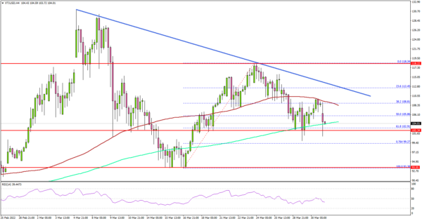 However, the bulls remained active near the $100.00 level and the 200 simple moving average (green, 4-hours). The price stayed above the 76.4% Fib retracement level of the upward move from the $92.36 swing low to $118.34 high.