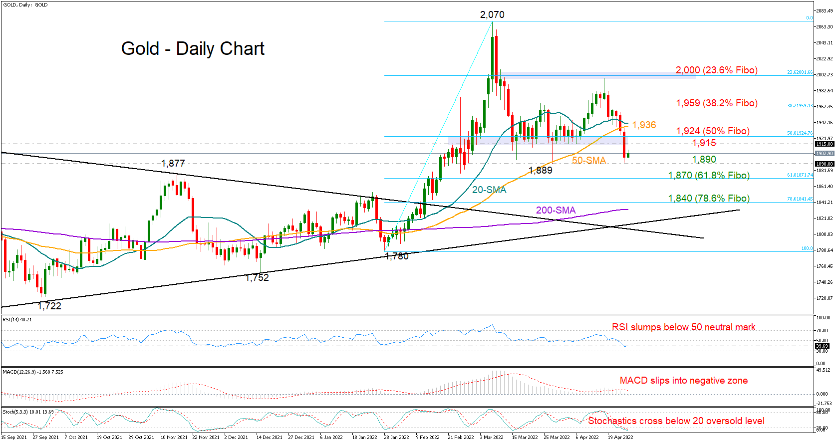 Gold started the week on the wrong foot, drifting below the $1,900 level on Monday after hitting a wall around the 50-day simple moving average (SMA) at $1,934.