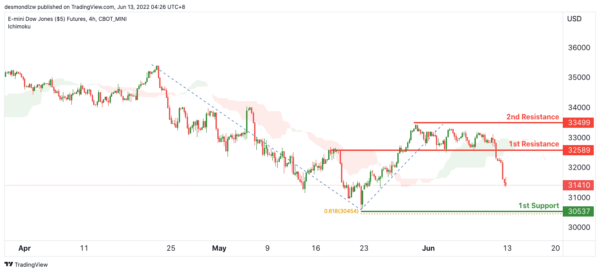 On the H4, with moving below our ichimoku cloud, we have a bearish bias that price will drop to our 1st support at 30537 in line with the horizontal swing low support and the 61.8% Fibonacci projection from our 1st resistance at 32589 where the pullback resistance is. Alternatively, price may break structure and head for our 2nd resistance at 33499 in line with the horizontal swing high resistance.