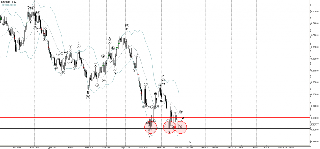 NZDUSD today reversed up from the key support level 0.6200 (which stopped the previous waves 3 and 1, as can be seen below).