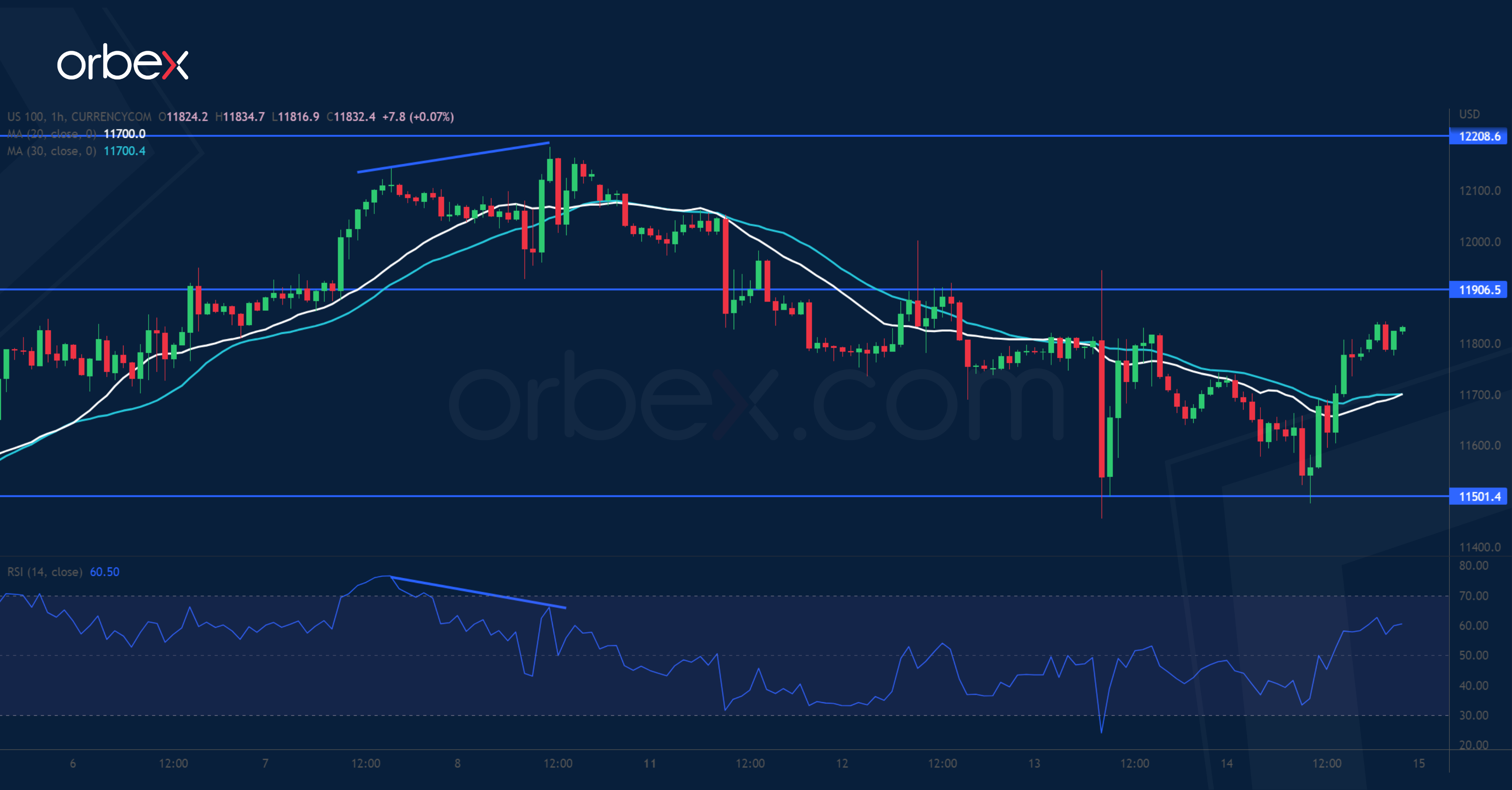 The Nasdaq 100 consolidates as investors assess second-quarter earnings. The index came to a halt at 12200 and a bearish RSI divergence showed a loss of momentum in that key supply zone. A drop below 11700 could be a confirmation that the bias remains down, putting buyers on the defensive. 11500 is a key level to keep the price action afloat. Its breach may send it to the daily support at 10500, where it could be vulnerable to a new round of sell-off. 11900 is a key hurdle to lift before a rebound could gain a foothold.