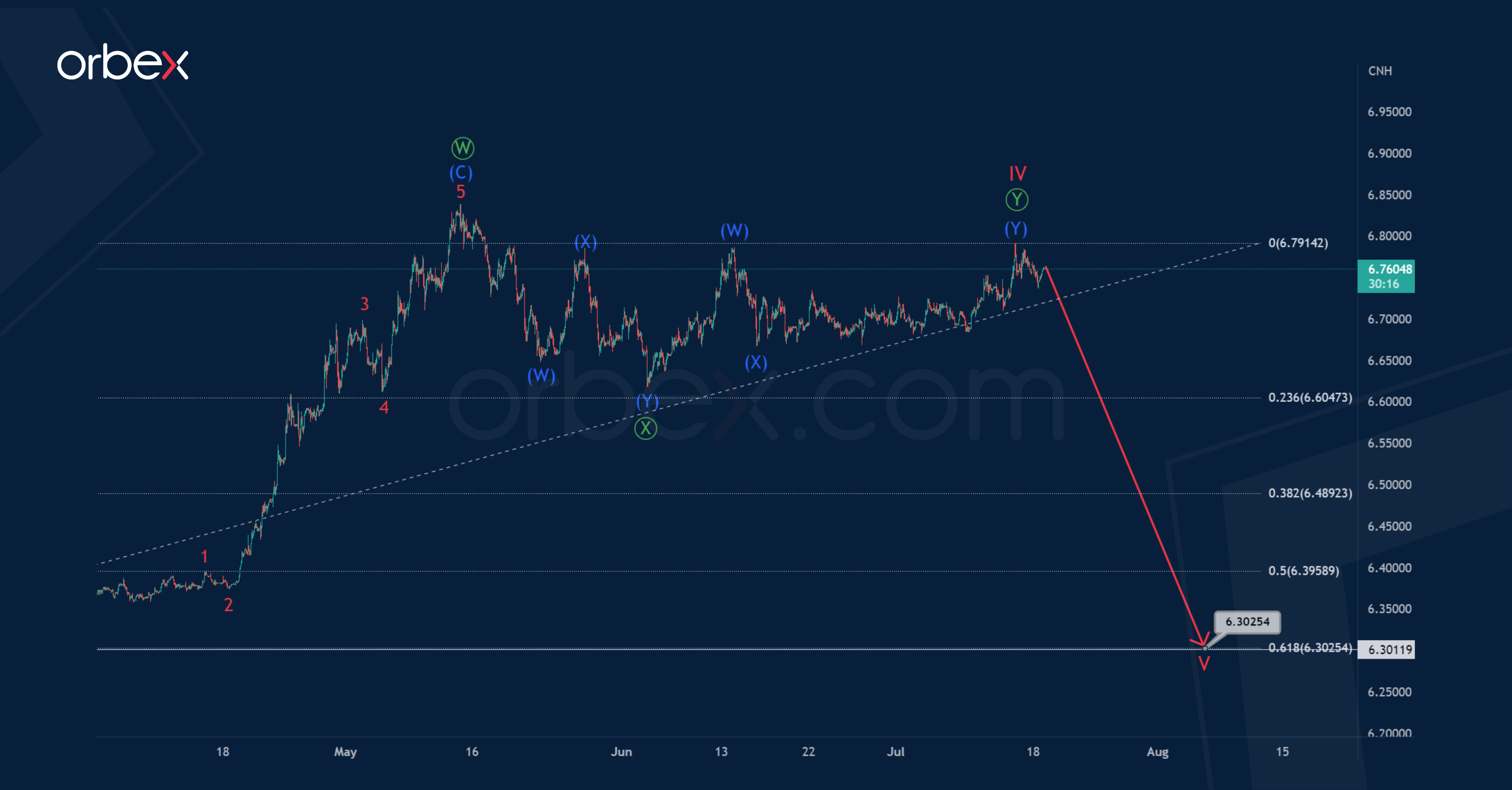 The internal structure of the USDCNH pair hints at the primary zigzag pattern Ⓐ-Ⓑ-Ⓒ, which in the long term forms a cycle correction IV. The correction model today looks completed in two parts out of three.