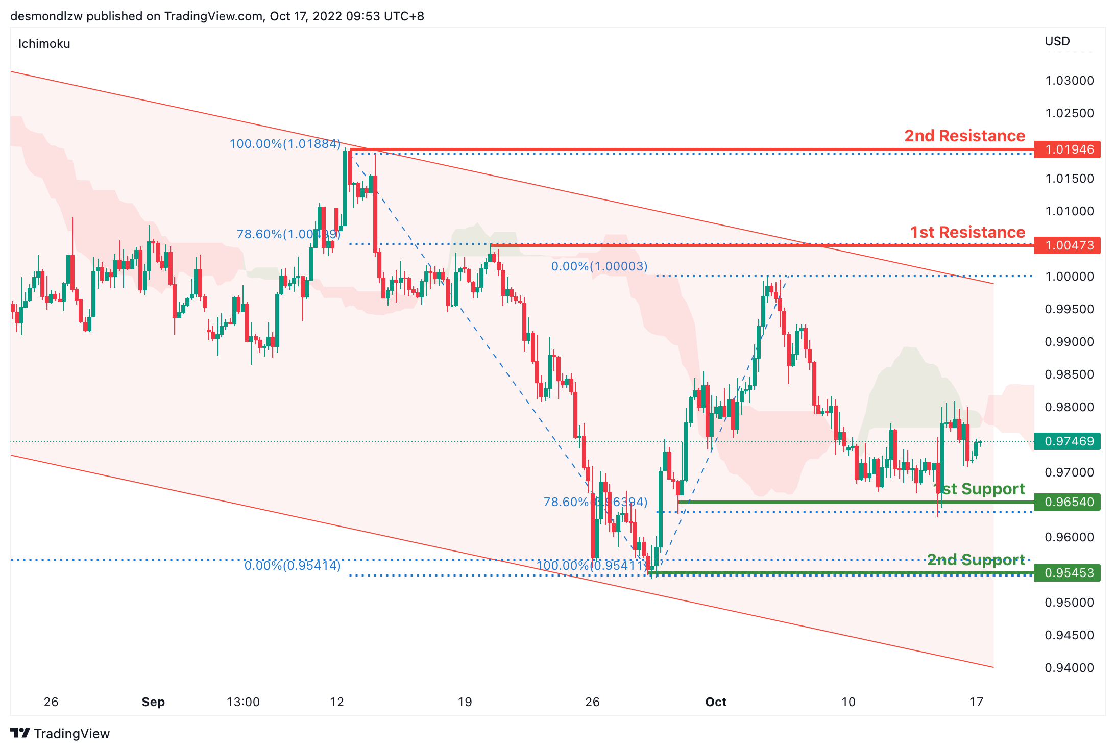 On the H4, price is moving within the descending trendline in a descending manner, with the price moving below ichimoku cloud- we are still overall bearish biassed. Although price has bounced off the first support at 0.9695 where the 61.8% retracement sits, it could still break this level and bring price to second support at 0.9545 where the swing low and 161.8% extension sit. Alternatively, price may test the first resistance at 1.0047 where the 78.6% retracement sits. If price breaks this level, it may test the second resistance at 1.0194, where the previous swing high sits