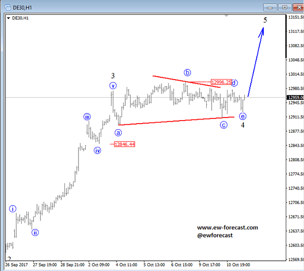 On German dax, we see price trading at the end of a corrective wave four. This corrective wave looks more and more like a triangle correction. A triangle correction is an Elliott wave pattern, that unfolds prior to the final wave, meaning once fully unfolded a new and final push into the direction of the trend may follow. In our case this is to the upside. That said, a triangle pattern consist out of five waves and usually each of them have three minor legs. Once the upper swing high of sub-wave b at 12996 level gets breached, that is when corrective wave 4 will be acknowledged as completed and more upside will be in store for the DAX.