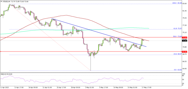- It broke a major bearish trend line with resistance near $70.80 on the 4-hour chart.