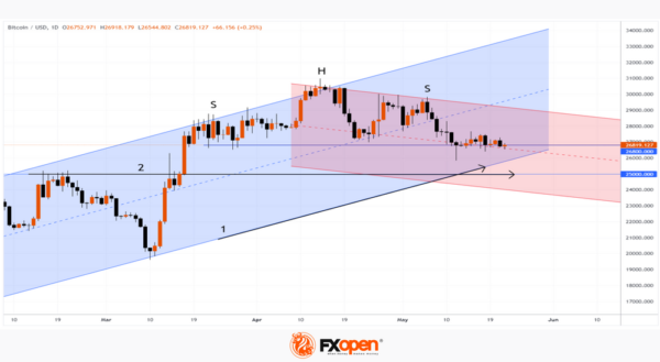 Meanwhile, bitcoin traders are looking with apprehension at the BTC/USD chart, which is forming a bearish head and shoulders (SHS) pattern. According to the classics of technical analysis, the breakdown of the “neck” level around 26,800 can lead to a downtrend. However, for this, sellers will have to apply serious pressure to overcome the support from the bottom line (1) of the ascending channel and the psychological mark (2) of USD 25k per bitcoin.