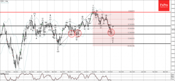 The upward reversal from the support level 32875.00 stopped the c-wave of the active ABC correction 2 from the end of July.