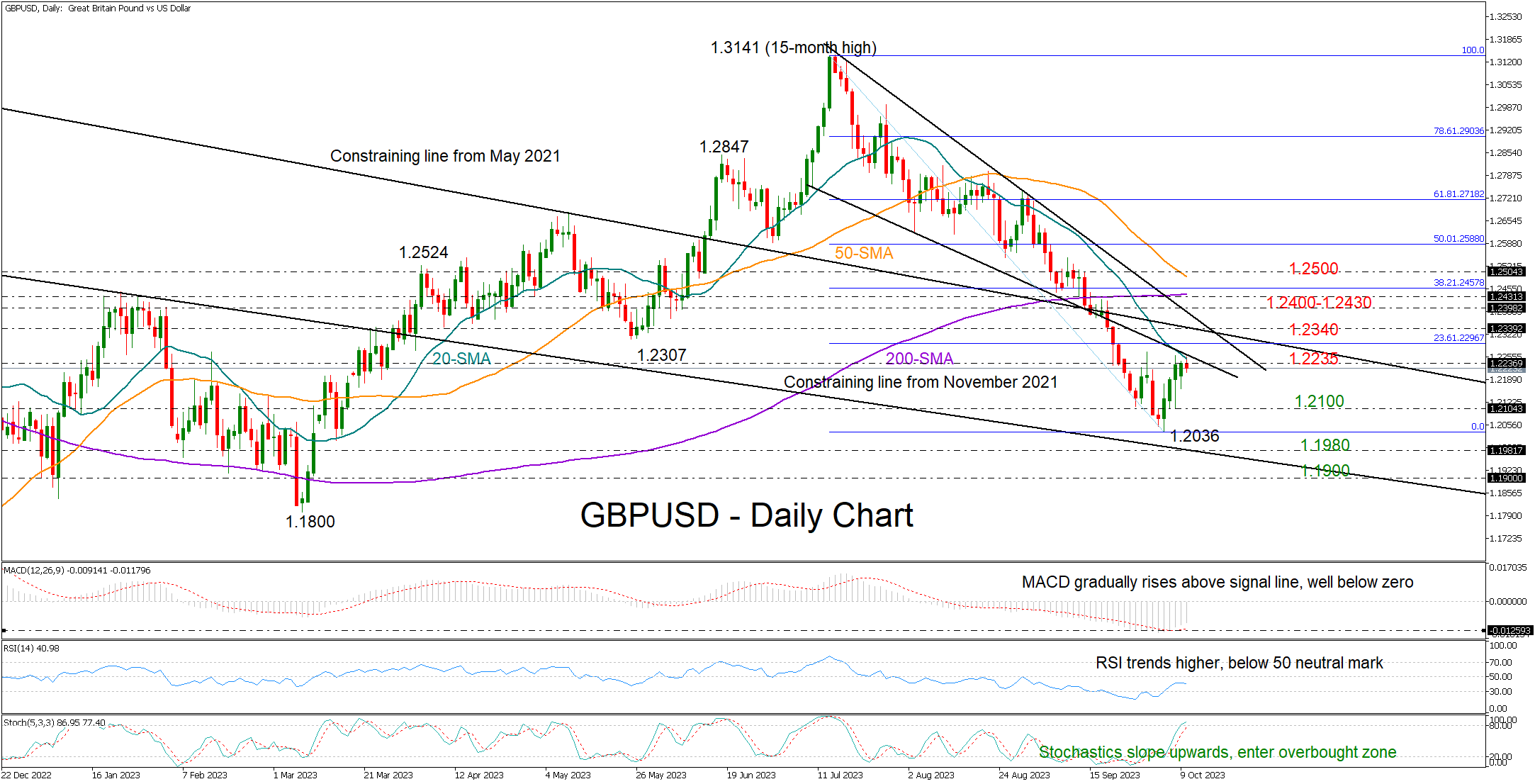 GBPUSD has been stagnant around the 1.2235 barrier for two days, hindered by the 20-day simple moving average (SMA) and the resistance line from July.