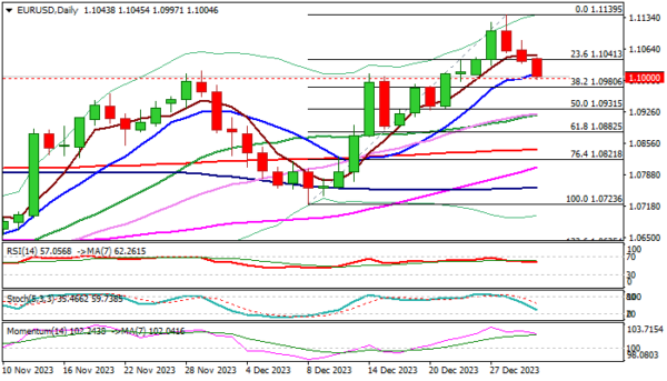 EURUSD keeps negative tone in the first trading day of 2024 and extends pullback from a multi-month high (1.1139) into third consecutive day.