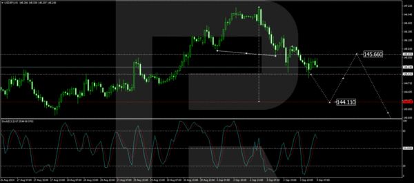 On the H1 chart, USD/JPY executed a downward impulse to 145.66 and has since been consolidating around this level. A break below the consolidation range could initiate the continuation of the downward trend towards 144.11. After reaching this target, a retest of 145.66 may be anticipated. This bearish scenario aligns with the Stochastic oscillator’s readings, where the signal line is just above 50 but indicates a downward movement.