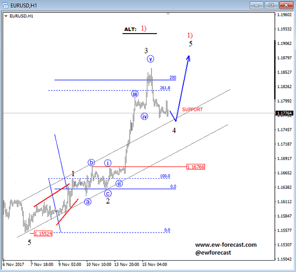 Once DAX completes a corrective rally, that’s when we may see a new strong push up on EURUSD, which is now seen in a corrective set-back. It can be wave four, or even wave two of a higher degree, but in both cases we expect market to resume the uptrend. Personally, I am hoping on a deeper and cleaner three wave drop before I may look for longs.