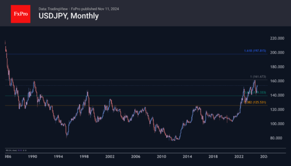 USDJPY jumped 0.8% on Monday, back to last week’s local highs at 154. The pair has risen more than 10% from the mid-September lows and has made intra-week highs for ten consecutive weeks. The drivers were first disappointed with the pace of monetary tightening, then the Trump trade. Political reshuffles following the surprise defeat of the ruling party and uncertainty about further rate hikes have also played a role.