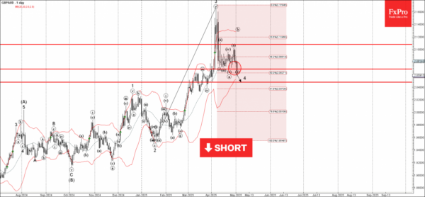 GBPAUD currency pair recently broke the support zone between the pivotal support level 2.0685 (which stopped the previous waves i, iii, v) and the 50% Fibonacci correction of the upward impulse from January.