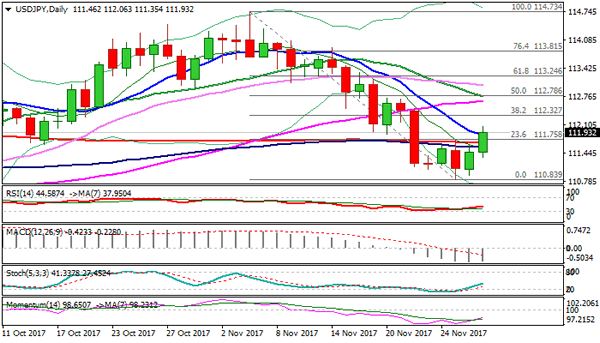 Extended bullish acceleration dented next resistance at 112.00 (falling Tenkan-sen), turning focus towards next pivot at 112.32 (Fibo 38.2% of 114.73/110.83 downleg).