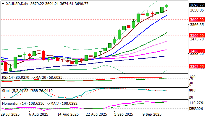 Psychological $3700 level is under increased pressure, with break here to expose next target at 3734 (Fibo 138.2% projection).