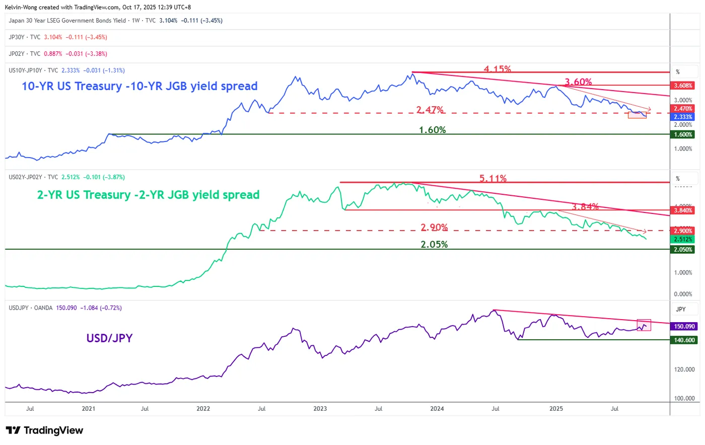 Fig. 1: Yield spreads of US Treasury/JGB with major trend of USD/JPY as of 17 Oct 2025 (Source: TradingView)