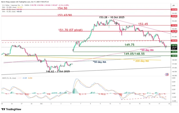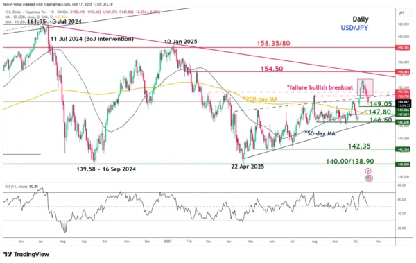 Since our prior report, the USD/JPY has witnessed a minor “momentum crush” as bullish sentiment of the US dollar took a backseat, where the USD/JPY did a residual push up to print an intraday high of 153.28 on 10 October 2025, before it tumbled by 2.2% to hit an intraday low of 149.90 at the time of writing.