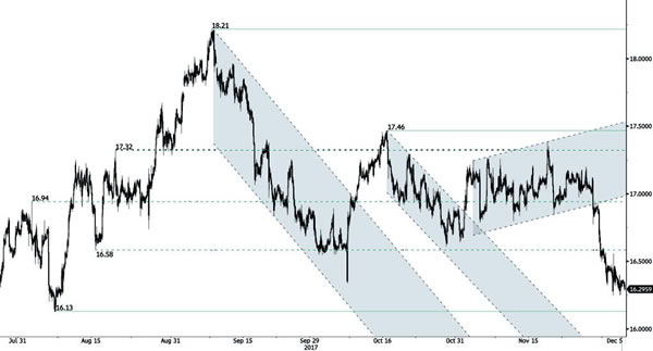 Silver is heading lower. Hourly support can be found at 16.13 (07/08/2017 low). Hourly resistance is given at 17.46 (13/10/2017 high). Expected to keep pushing lower.