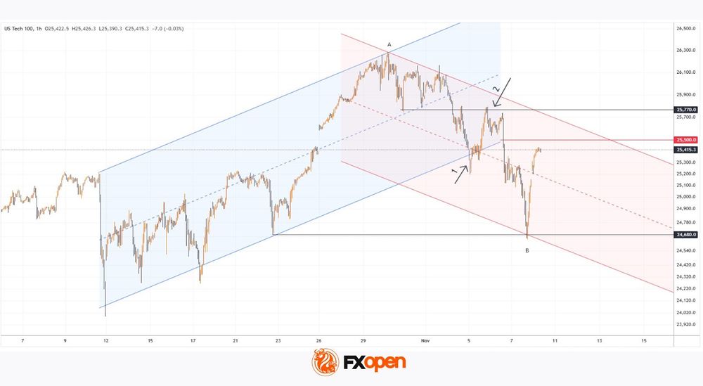 Analysing the hourly chart of the Nasdaq 100 (US Tech 100 mini on FXOpen) on 4 November, we: