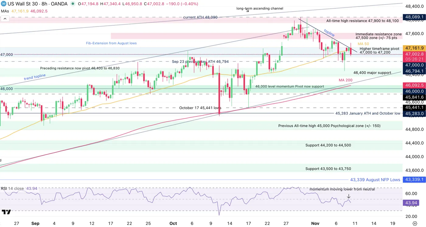 Dow Jones 8H Chart, November 10, 2025 – Source: TradingView