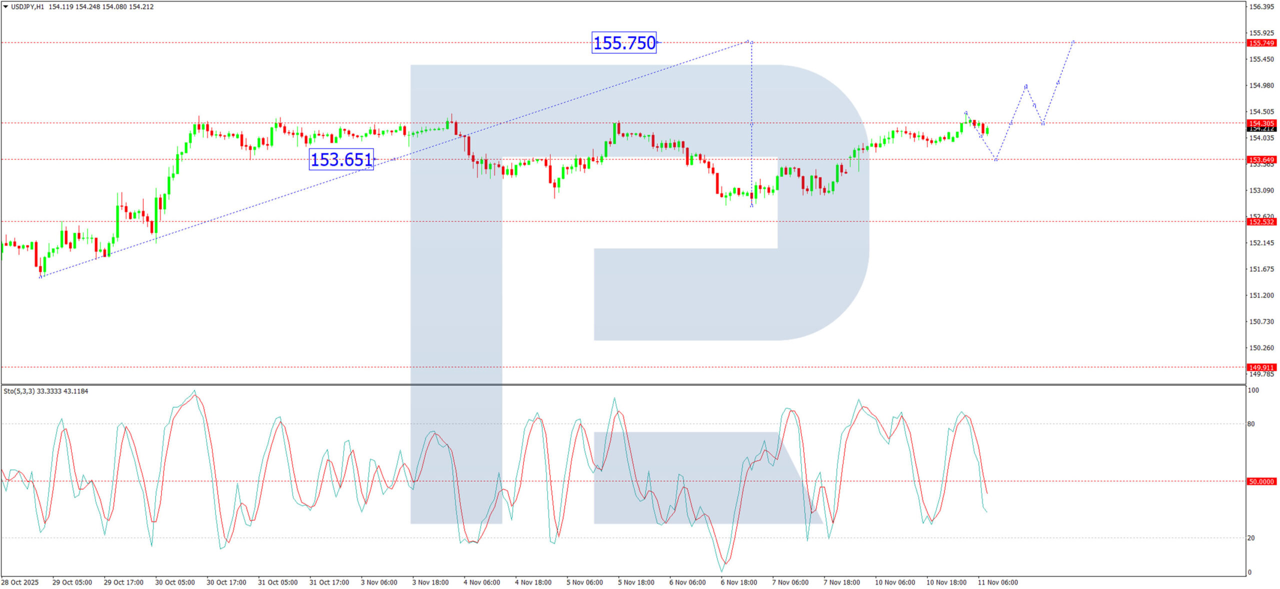 On the H1 chart, the pair has completed an initial growth impulse to 154.48. A near-term correction towards 153.65 is now expected. Once this corrective phase concludes, we anticipate the resumption of the broader upward trend, with the next primary target at 155.70. The Stochastic oscillator corroborates this view. Its signal line is below 50 and trending downwards towards 20, suggesting that short-term downward pressure (the expected correction) is building before the next potential upward wave.