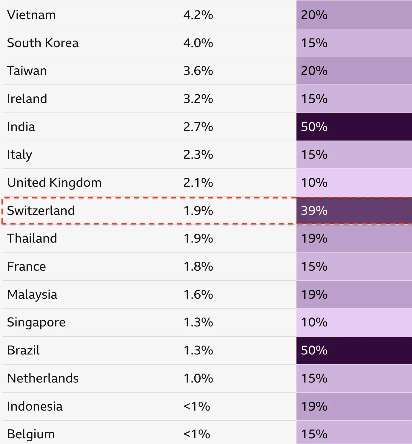 Different tariff rates per economy – Source: BBC