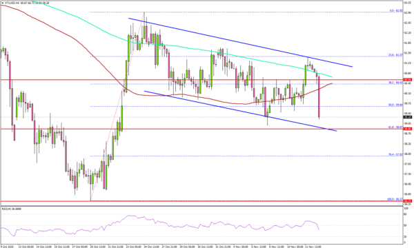 Looking at the 4-hour chart of XTI/USD, the price declined below the 50% Fib retracement level of the upward move from the $56.37 swing low to the $62.92 high. The price also settled below $60.50, the 100 simple moving average (red, 4-hour), and the 200 simple moving average (green, 4-hour).
