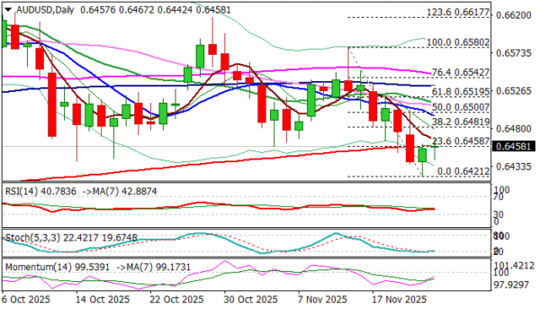 On the other hand, quick bounce from the session low (1.1406, slightly below Fibo 61.8% of 1.1283/1.1636 upleg), signals that bears face headwinds at pivotal 1.1400 zone, but bearish hourly studies add to scenario of limited upticks providing better levels to re-enter bearish market.