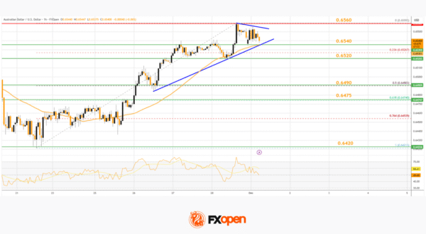 • There is a short-term contracting triangle forming with support at 0.6540 on the hourly chart of AUD/USD at FXOpen.