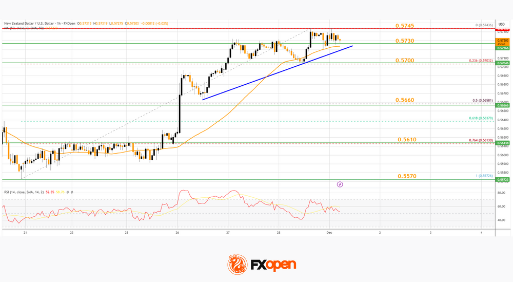 • There is a major bullish trend line forming with support at 0.5730 on the hourly chart of NZD/USD at FXOpen.