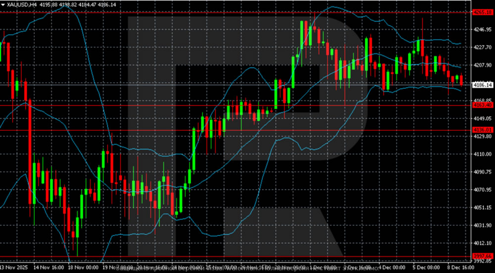On the H4 chart, XAU/USD continues to consolidate in a sideways range following its late-November advance. The price is currently trading below the middle Bollinger Band, suggesting a gradual loss of bullish momentum. The upper band has flattened, confirming the consolidation phase within the 4,163–4,240 USD zone.