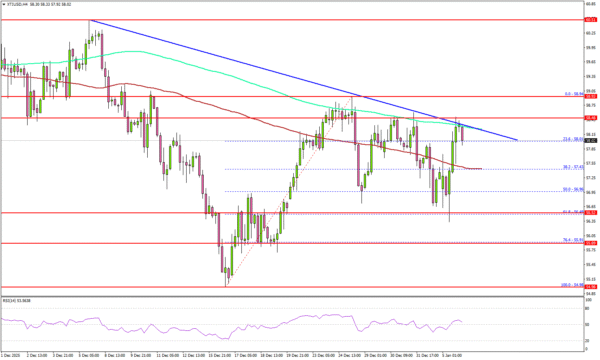 - A key bearish trend line is forming with resistance at $58.30 on the 4-hour chart.