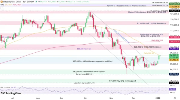 Bitcoin is getting back on a bullish momentum but faces a key test at its 50-Day Moving Average, currently at $94,180.