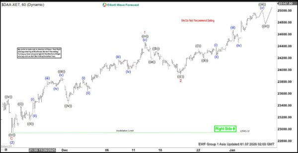 The DAX continues to advance to new highs, confirming that the right side of the market remains bullish. The decline from the November 21, 2025 low at 22,943 marked the end of wave (2). From that level, the Index began a rally in wave (3), unfolding with clear internal subdivisions consistent with an impulsive Elliott Wave structure. Wave ((i)) concluded at 23,392.2, followed by a pullback in wave ((ii)) that ended at 23,139.27. The Index then extended higher in wave ((iii)) toward 23,883.98. A corrective dip in wave ((iv)) found support at 23,433.48. The final leg, wave ((v)), carried prices to 24,474.62, completing wave 1 of a higher degree sequence.
