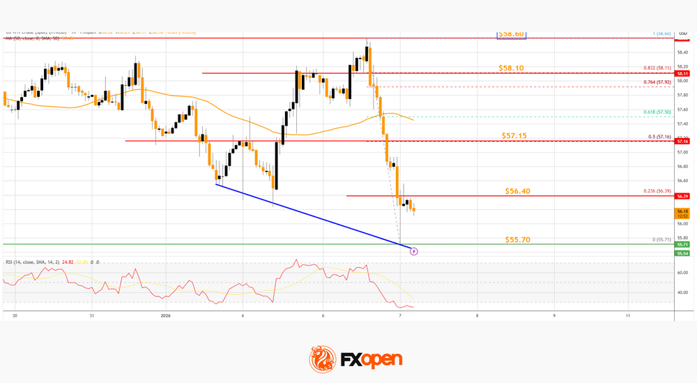 - There is a connecting trend line forming with support at $55.70 on the hourly chart of XTI/USD at FXOpen.