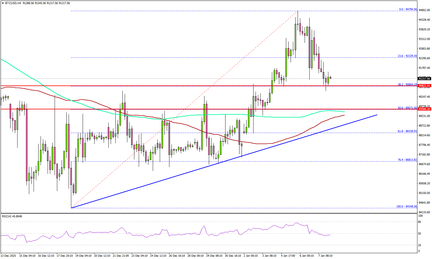 Recently, there was a downside correction below the 23.6% Fib retracement level of the upward move from the $84,384 swing low to the $94,794 high.