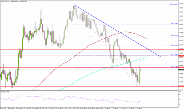 Looking at the 4-hour chart, the pair settled below 1.1700, the 100 simple moving average (red, 4-hour), and the 200 simple moving average (green, 4-hour). The pair even tested 1.1620. A low was formed at 1.1618, and the pair is now recovering some losses.