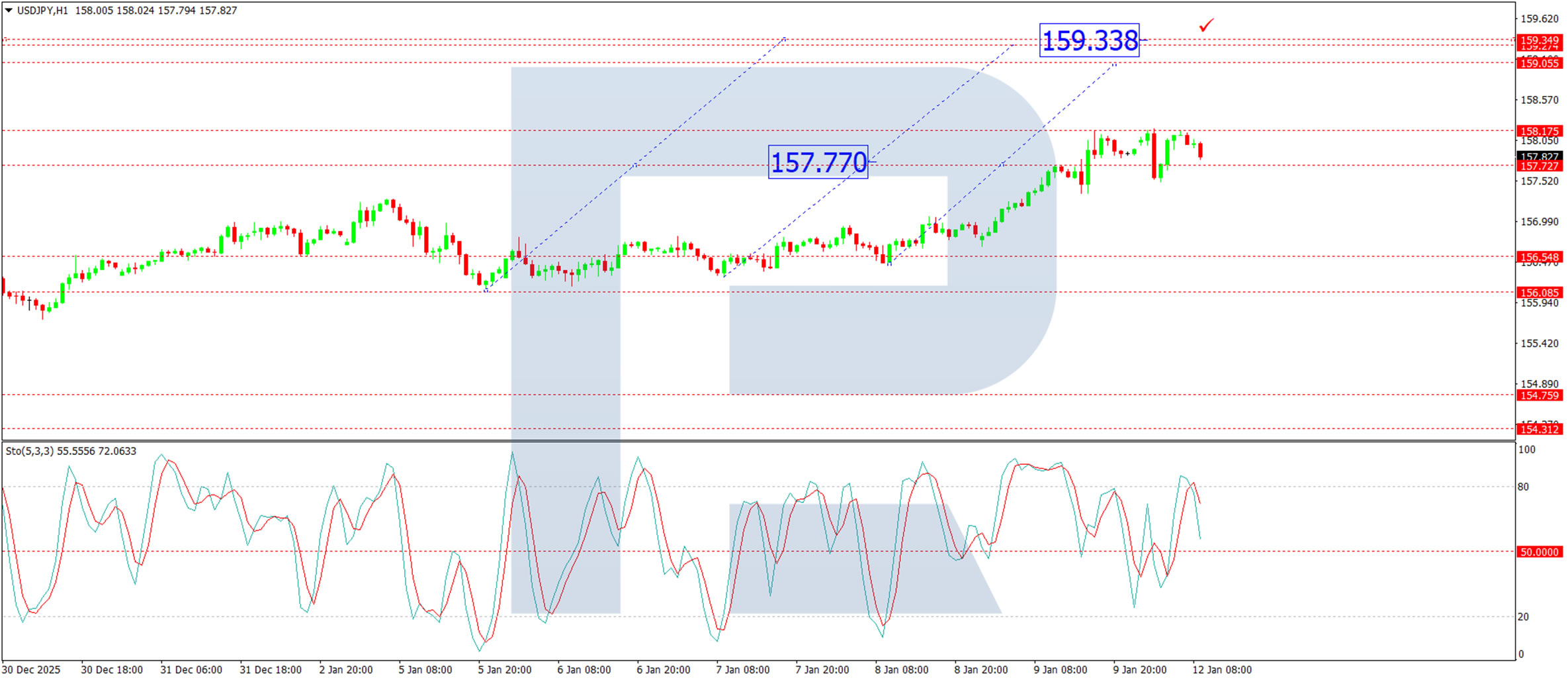 On the H1 chart, the market is forming a consolidation range centred around 157.77, with interim boundaries at 158.18 to the upside and 157.50 to the downside. A downward exit from this range could see a decline towards 156.60, while an upward resolution would signal potential for a further move towards 159.33. The Stochastic oscillator aligns with this view, as its signal line is above 50 and rising towards 80, suggesting continued near-term upward momentum.