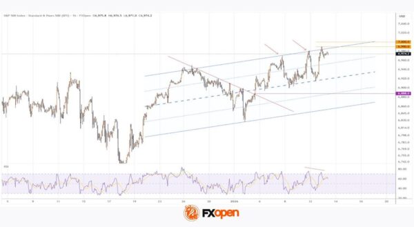 As the S&P 500 chart shows (US SPX 500 mini on FXOpen), the index touched 6,990 yesterday, marking an all-time high for the first time. The psychological 7,000 level is now within close reach. Optimism may be driven by the start of the earnings season, which could confirm continued growth in corporate profits.