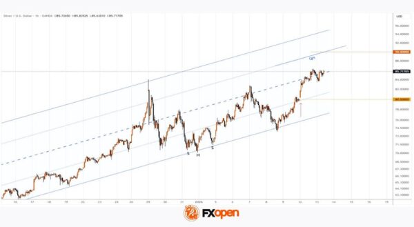 As the XAG/USD chart shows, the price of silver per ounce is consolidating near its all-time high, which lies above $85.