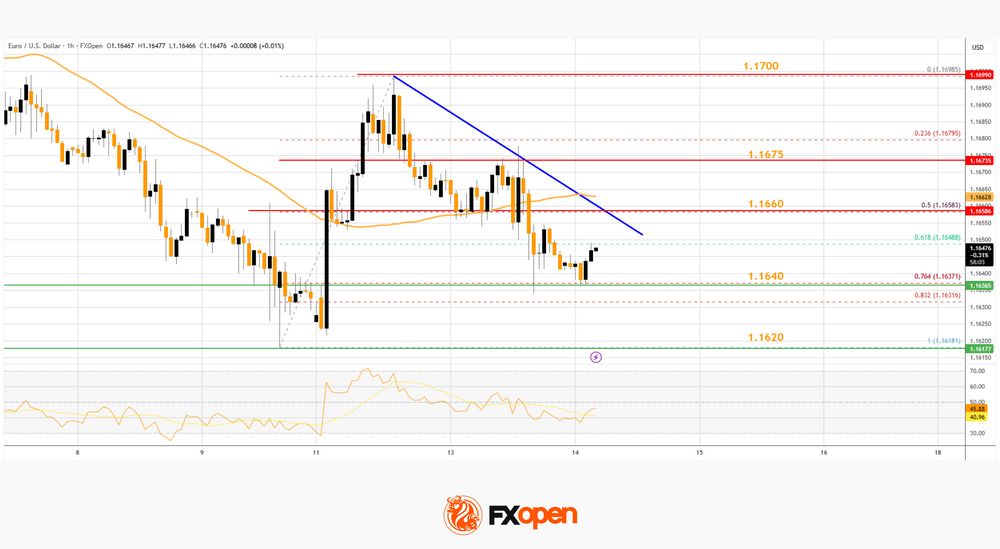 - There is a bearish trend line forming with resistance at 1.1660 on the hourly chart of EUR/USD at FXOpen.
