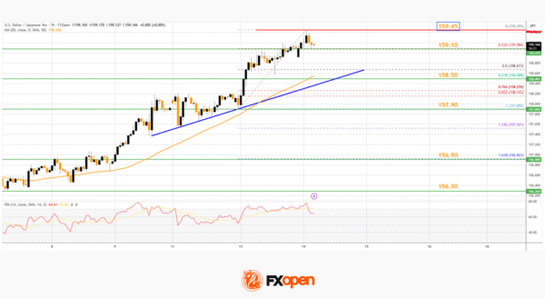 On the hourly chart of USD/JPY at FXOpen, the pair started a major increase from 157.00. The US Dollar gained bullish momentum above 158.00 against the Japanese Yen.