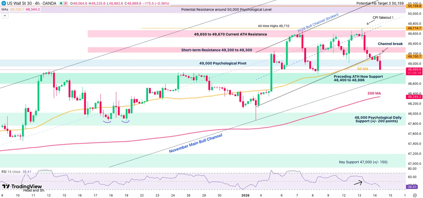 Dow Jones (CFD) 4H Chart – January 14, 2026 – Source: TradingView