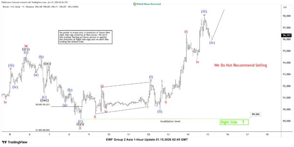 A pullback in wave (iv) is anticipated to correct the cycle from the January 12, 2026 low before the final push higher in wave (v) completes wave ((a)). In the near term, as long as the pivot at $89,222 remains intact, dips are expected to find support in 3, 7, or 11 swings, favoring further upside continuation.