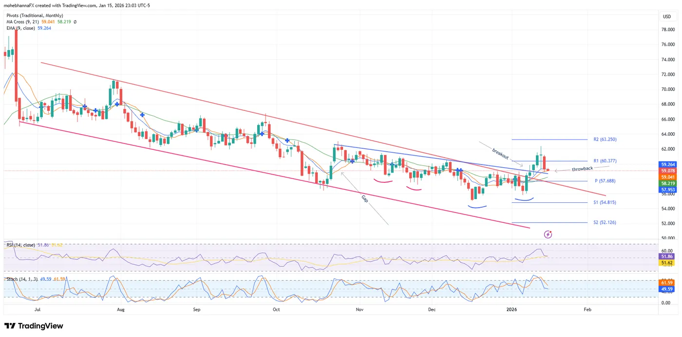 - As of June 2025, crude oil has been trading within a descending Channel, as marked by the red lines on the above chart. On Friday, January 9th, 2026, price action broke above the descending channel’s upper boundary and has remained above it since. The break took the price above a confluence of resistance, the intersection of the SMA21, the upper channel boundary, and the monthly PP at 57.68. The broken level has now turned into support.