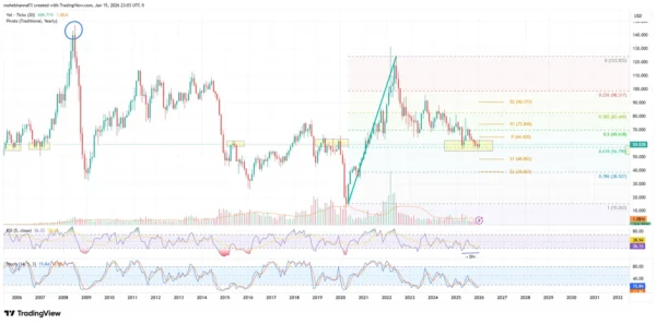 - Applying the Fibonacci retracement (FIB) level to the “V-shaped” recovery from the 2020 lows (green diagonal line), which peaked in 2022 near $123.00, reflects that the current price of $59.22 is situated within a critical technical “battleground” defined by yearly levels.