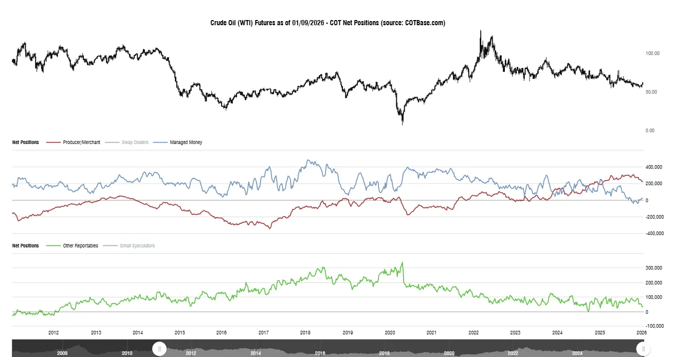 The most recent COT report, released on January 9th, 2026, including data up to January 6th, 2026, reflected that the “Managed money” category has reached a 15-year net short position level extreme, and is currently moving towards net long territory, suggesting that a change in sentiment and a reversal may be in play. Producers/Merchants’ positioning is also moving towards short after reaching an all-time high, an extreme long position level.
